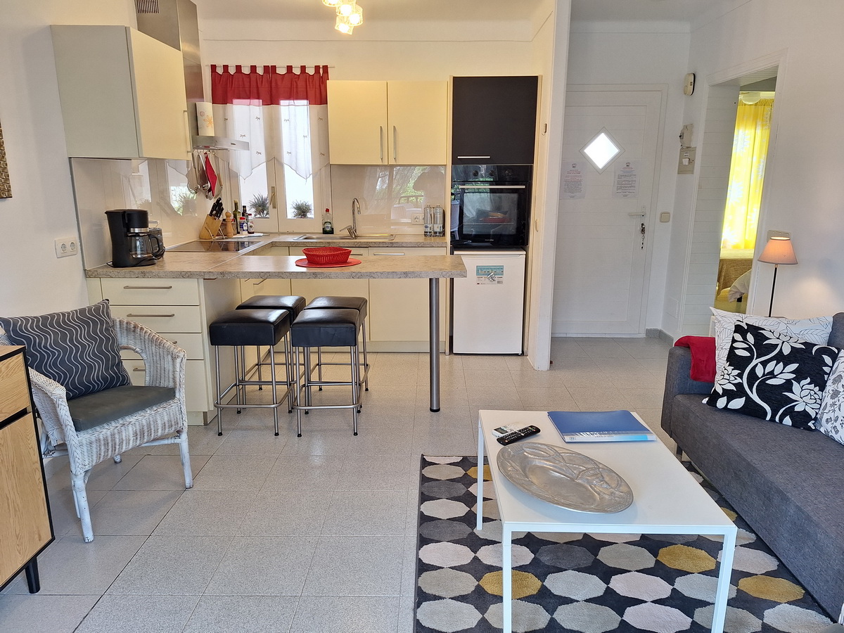 The apartment is located on teh first floor and offers views over a green belt down to teh Marina. Here 4 people can be comfortably accommodated, since the apartment has 2 bedrooms, 1 bathroom with shower, living room with equipped kitchen with access to the terrace with dining table.